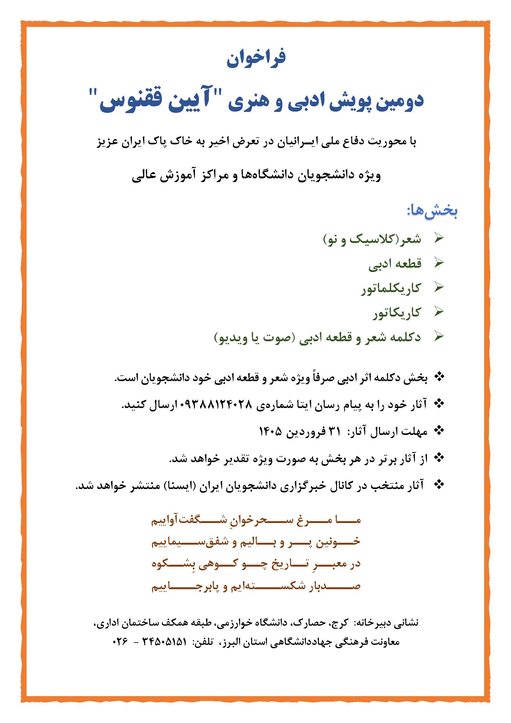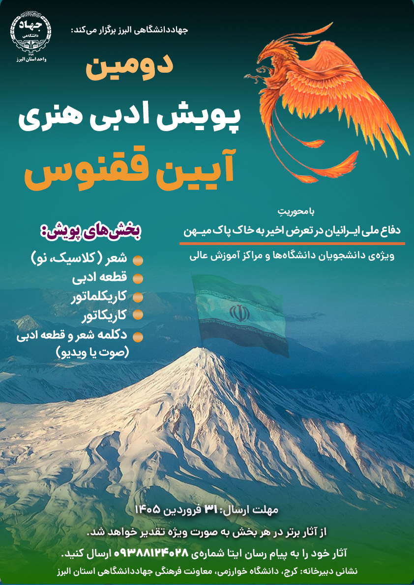 مهلت ارسال آثار تا 31 فروردین 1405 تعیین شده است و علاقهمندان برای شرکت در این پویش میتوانند آثار خود را در پیامرسان ایتا به شماره 09388124028 ارسال کنند.